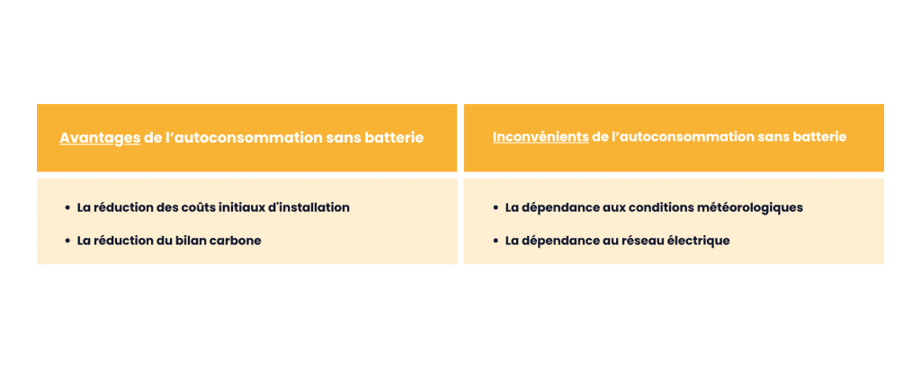 Sans batterie, il est impossible de stocker le surplus d’énergie produit pour l’utiliser plus tard. L’autoconsommation sans batterie implique donc de consommer immédiatement l’électricité générée par vos panneaux photovoltaïques.