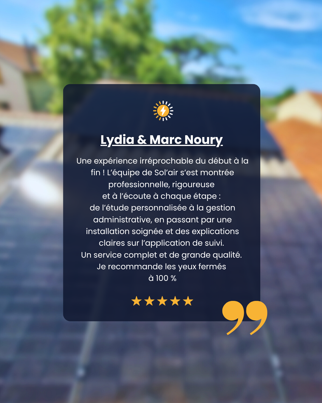 « Une expérience irréprochable du début à la fin ! L’équipe de Sol’Air Energie s’est montrée professionnelle, rigoureuse et à l’écoute à chaque étape : de l’étude personnalisée à la gestion administrative, en passant par une installation soignée et des explications claires sur l’application de suivi.